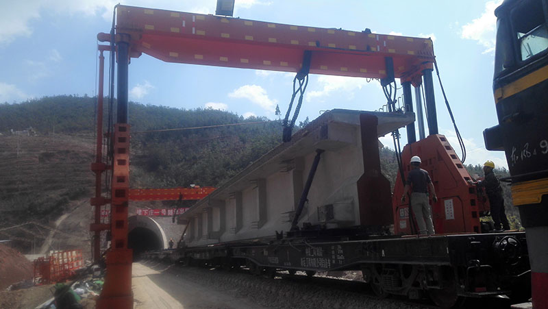 雙線倒裝龍門架是一種跨雙線的梁片或軌排的倒裝龍門架,它可在平車和炮車之間通過橫移方式實現梁片或軌排的吊裝。既適用于雙線倒裝,也適用于單線倒裝。支起時內部空間可通過機車。運輸時滿足限界要求。倒裝龍門架主要由增高節(jié)、底架總成、柴油發(fā)電機、液壓系統、電控系統、導向柱組成、升降機構、護架組成、起重梁、橫移機構、吊繩裝置、油缸總成等部分組成。
